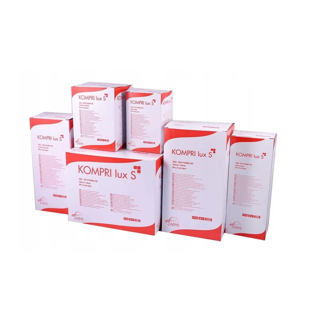 Kompresy gazowe KOMPRI LUX S są jałowe i pakowane pojedynczo w blistry, co gwarantuje maksymalną higienę przy każdym użyciu. Mogą być sterylizowane parą wodną, tlenkiem etylenu lub radiacyjnie, co zapewnia ich szerokie zastosowanie w różnych warunkach klinicznych.