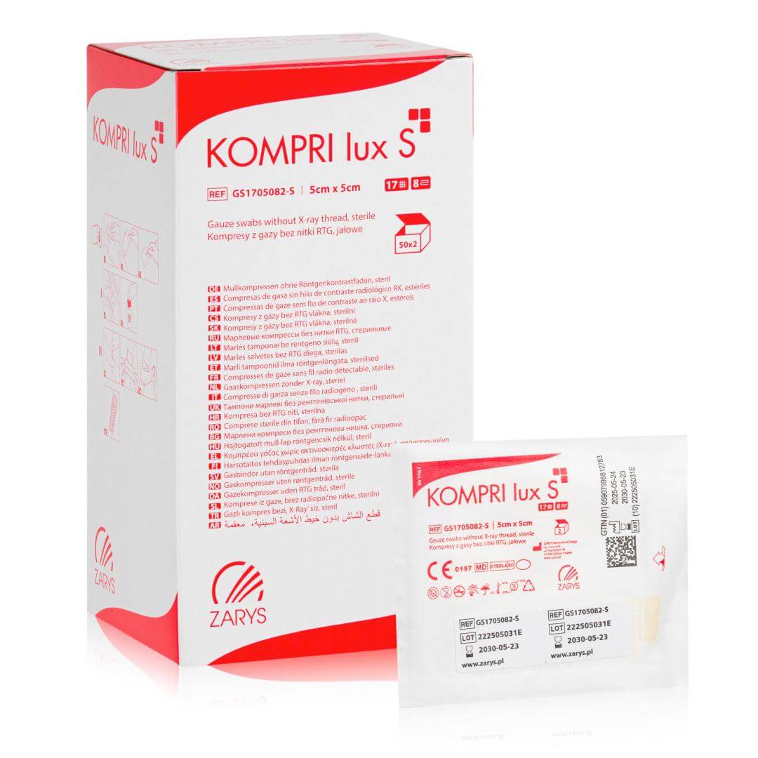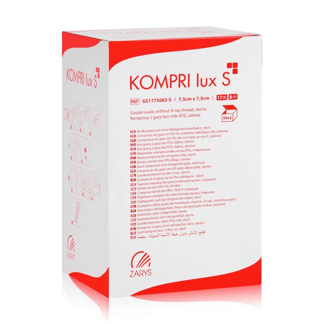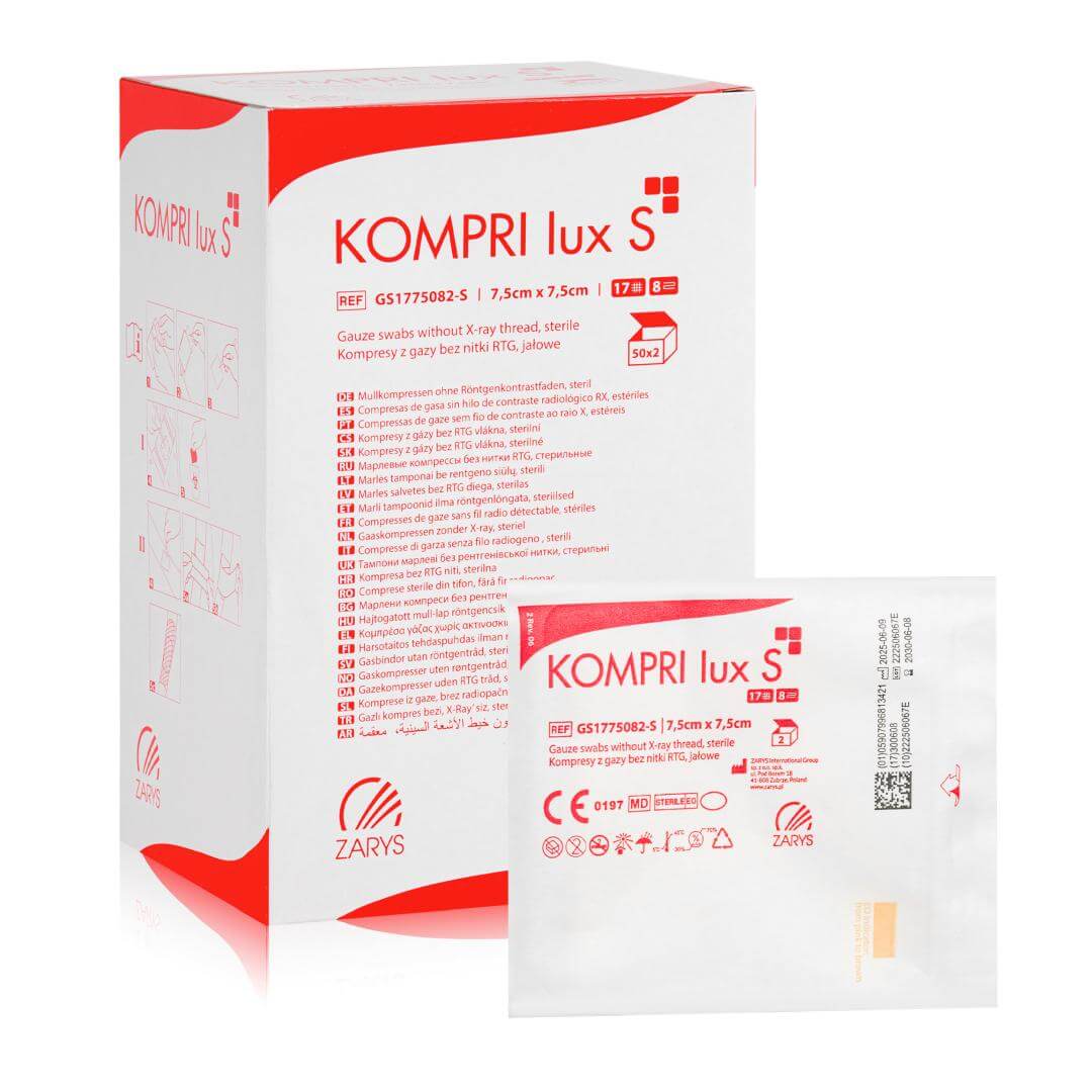 to sterylny kompres gazowy wykonany z najwyższej jakości hydrofilowej bawełny, bielonej bez użycia chloru – wyłącznie z wykorzystaniem wody utlenionej. Produkt został zaprojektowany z myślą o bezpiecznym, higienicznym i komfortowym opatrywaniu ran. Dzięki zastosowaniu składania typu „ES", brzegi kompresu są podwójnie podwinięte, co zapobiega wysnuwaniu się nitek i podnosi poziom bezpieczeństwa w trakcie zabiegów. Produkt rekomendowany do użytku w gabinetach medycyny estetycznej, podologii oraz stomatologii. Kompresy gazowe KOMPRI LUX S są jałowe i pakowane po dwie sztuki w blistry, co gwarantuje maksymalną higienę przy każdym użyciu. Mogą być sterylizowane parą wodną, tlenkiem etylenu lub radiacyjnie, co zapewnia ich szerokie zastosowanie w różnych warunkach klinicznych. Wykonane w 100% z miękkiej, naturalnej bawełny, doskonale chłoną płyny i nie podrażniają skóry. Idealnie sprawdzają się w trakcie zabiegów wymagających delikatnego, ale skutecznego kontaktu z naskórkiem.