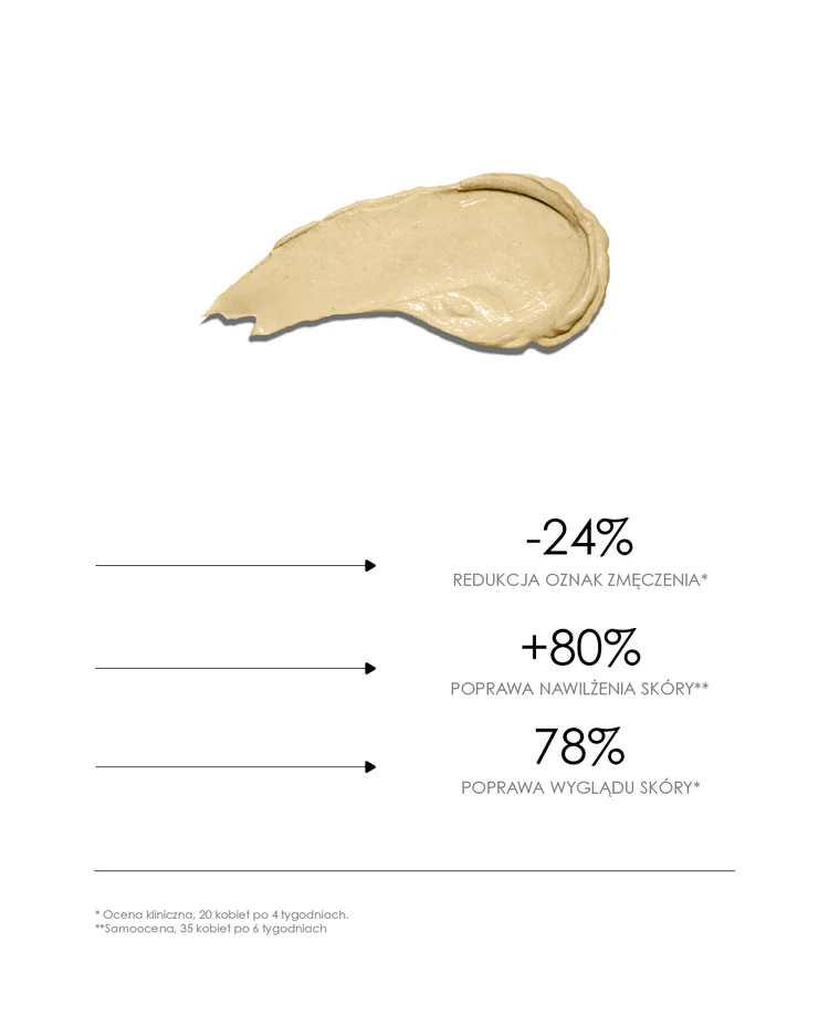 Zawartość 24-karatowego złota oraz ekstraktu z masy perłowej nadaje skórze wyjątkowy blask i wyrównuje jej koloryt. Dzięki silnym właściwościom antyoksydacyjnym i regenerującym, skóra staje się świetlista i wygląda na wypoczętą.
